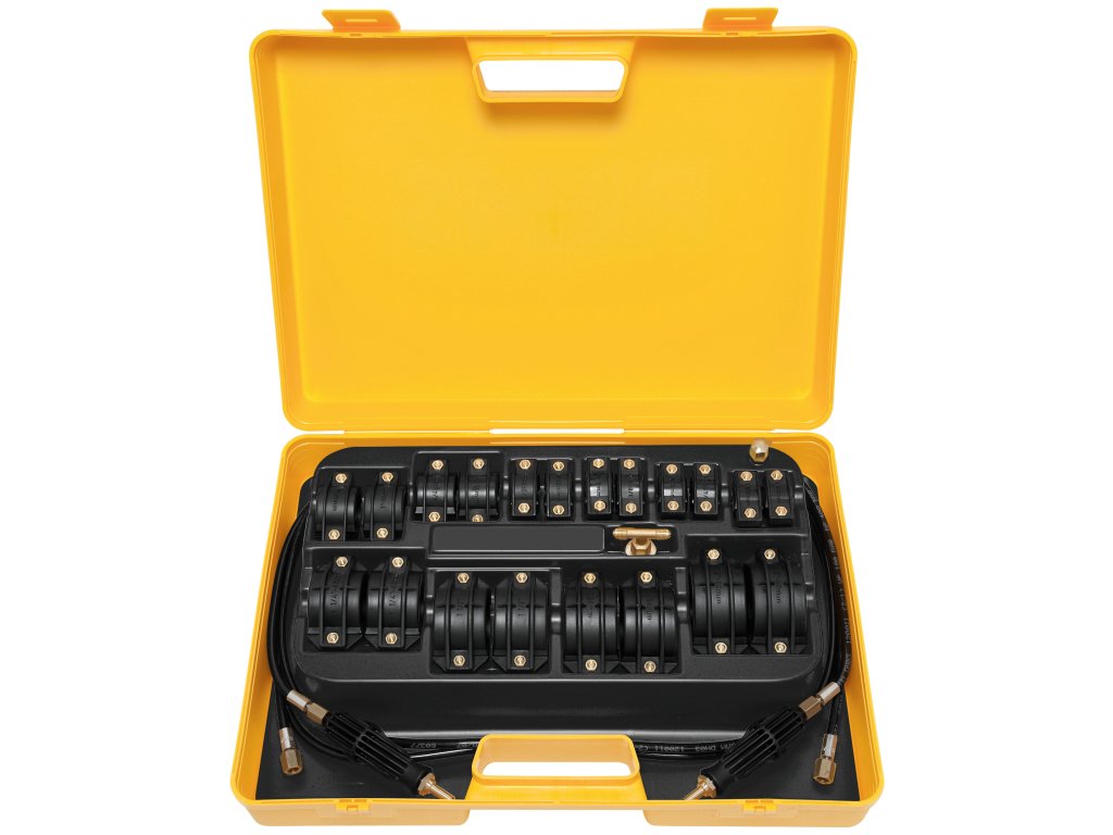 Zmrazovač trubek pro zmrazovací médium kysličník uhličitý. Pro ocelové, měděné, plastové a vrstvené trubky, Ø ⅛ – 2", Ø 10 – 60 mm. Po 2 kusech zmrazovacích manžet v 10 různých velikostech pro celkový pracovní rozsah, připojení na láhev s T-rozdělovačem, uzavírací matice, 2 rukojeti s injektorem, 2 vysokotlaké hadice. V pevném kufru.
