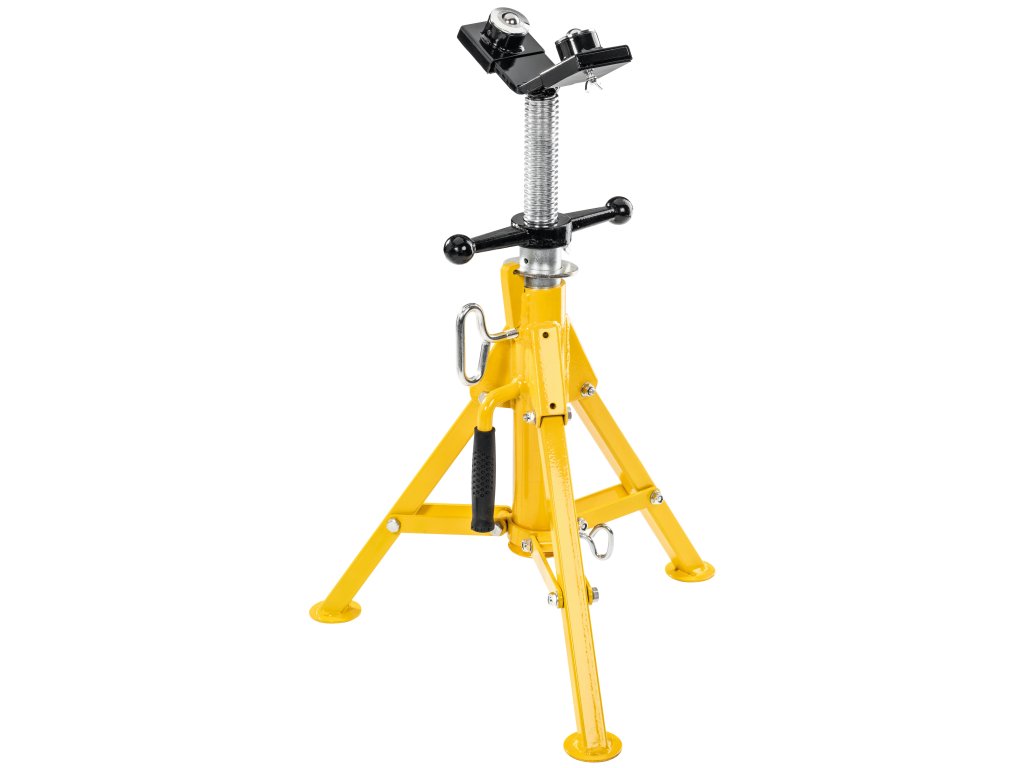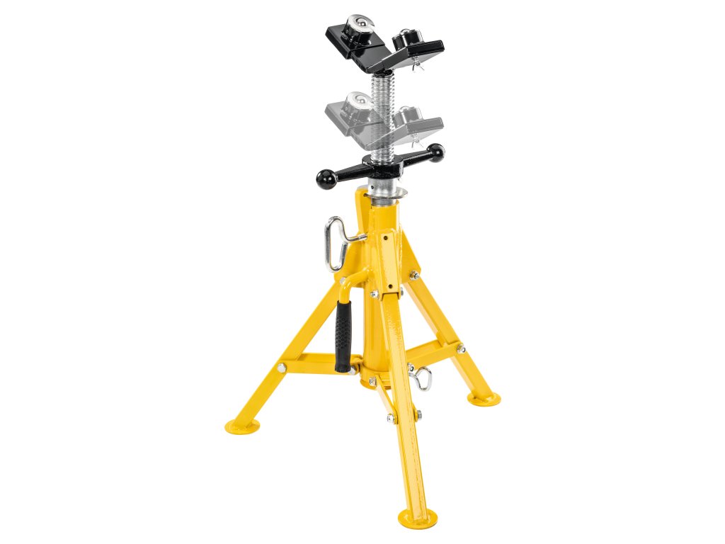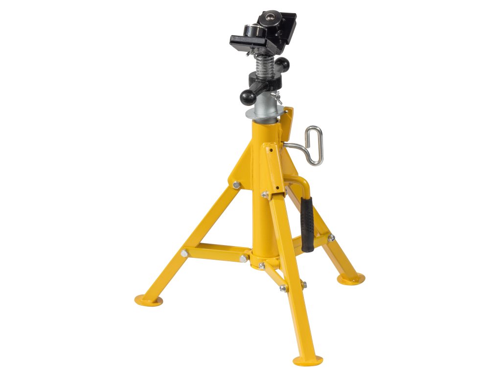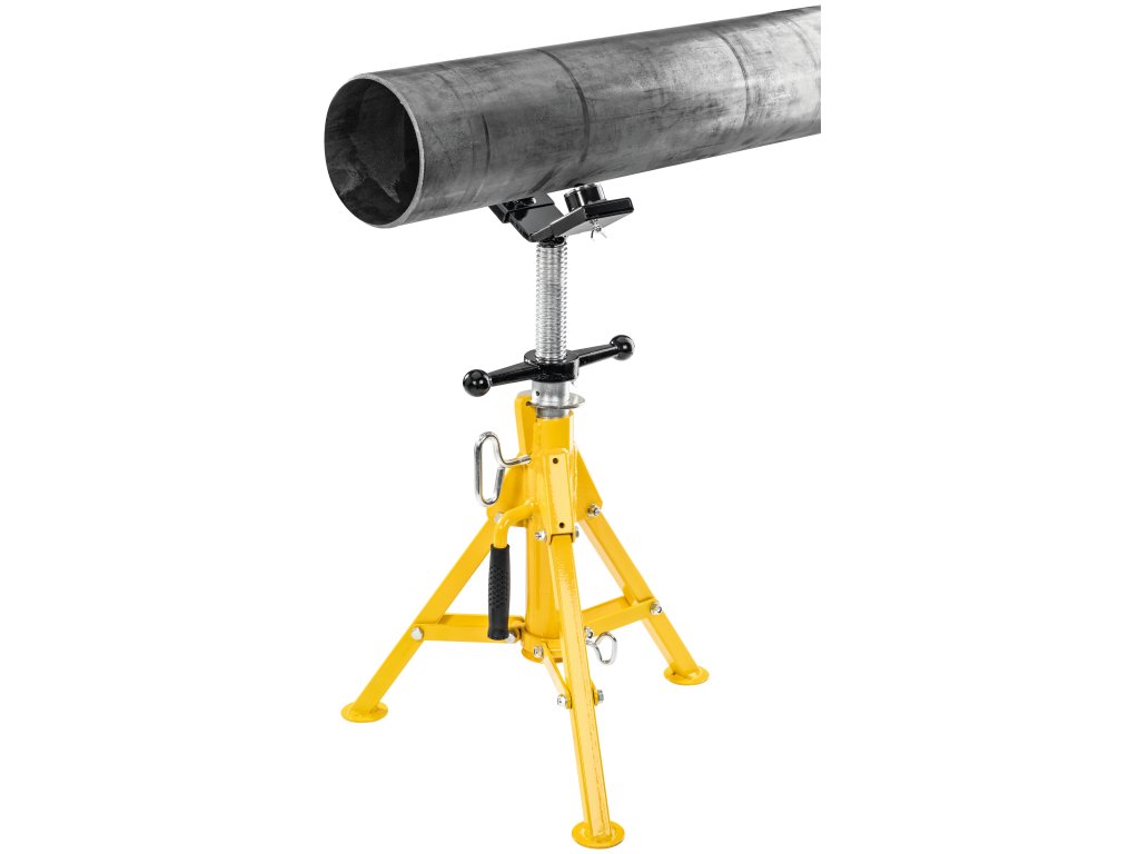 Obzvláště vhodná při instalaci trubek, např. při válcování drážek, dělení, řezání závitů, svařování, pájení. Snadný pohyb materiálu ve všech směrech během otáčení, tažení a posuvu díky dvěma kuličkám z nerezové oceli uloženým v pouzdrech chráněných proti korozi v rozsahu Ø 1¼ – 12", Ø 42 – 324 mm. Robustní konstrukce, vhodná na stavbu. Bezpečně stojící 3-nožka, sklopná pro transport a skladování. Výškově stavitelný od 505 do 915 mm na podlaze. Závitové vřeteno k jednoduchému polohování trubky, se zařízením k zajištění polohy. Praktická rukojeť k přenášení, pro snadný transport.