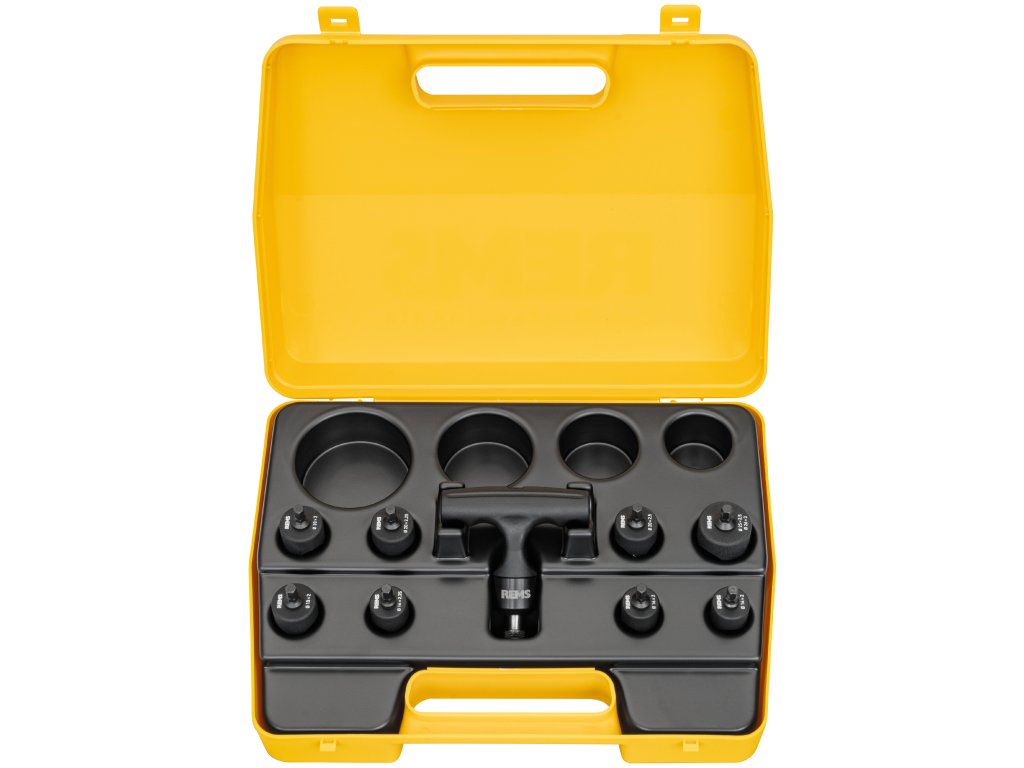 REMS KaliGrat E – zároveň provádět kalibraci a vnější/vnitřní odhrotování. Ráčnová rukojeť s vyměnitelnými kalibračními a odhrotovacími hlavami, s držákem pro rychlou výměnu.