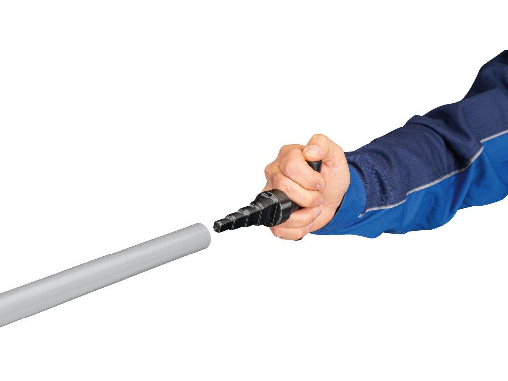 REMS KaliGrat R – zároveň provádět kalibraci a vnitřní odhrotování. Ráčnová rukojeť se stupňovitým kalibračním trnem s integrovanými odhrotovacími břity.