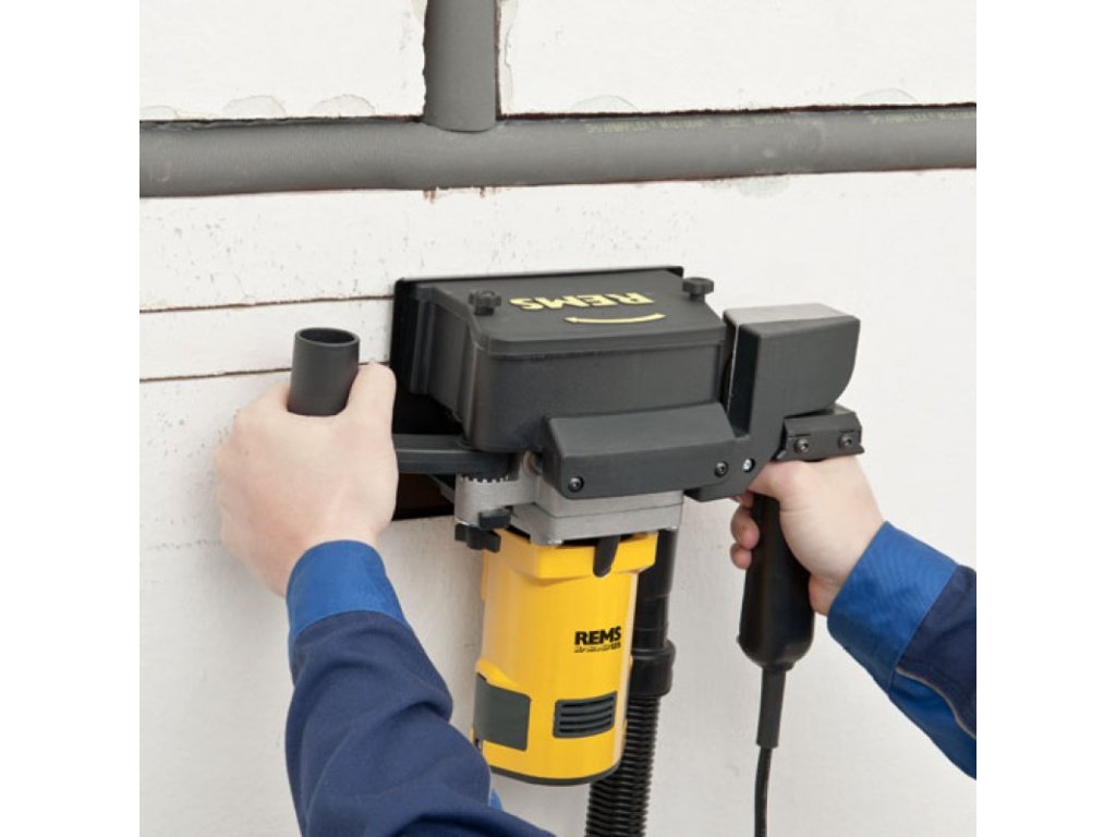 Elektrická diamantová drážkovací a dělící bruska k drážkování a dělení, např. betonu, železobetonu, zdiva všeho druhu, přírodního kamene, mazaniny všeho druhu. Hloubka drážky 38 mm, plynule nastavitelná. Šířka drážky 43 mm, odstupňována distančními podložkami 3, 6, 10, 20 mm. Pohonný stroj s pohonnou hřídelí průměr 22,2 mm, pro 1 nebo 2 diamantové dělící kotouče dle EN 13236, průměr 125 mm, s převody pracujícími bez údržby s bezpečnostní kluznou spojkou, univerzální motor 230 V, 50 – 60 Hz, 1850 W. Multifunkční elektronika s pozvolným rozběhem, omezením otáček naprázdno, pojistka proti přetížení. Bezpečnostní spínač. Otáčky při zatížení 5000 min-1. Odsávací hrdlo k připojení vysavače / odsavače prachu (např. REMS Pull M). Nástrčný klíč SW 13. V pevném kufru.