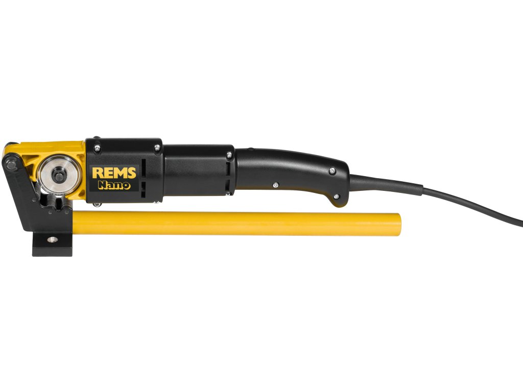 REMS Nano Basic-Pack. Elektrický řezák trubek k rychlému, pravoúhlému dělení trubek Ø 10–40 mm, bez vnějšího otřepu. Pro trubky systémů s lisovanými tvarovkami z nerezavějící oceli, C-oceli, Ø 12–28 mm, mědi Ø 10–35 mm. Vrstvené trubky Ø 10–40 mm. S převody, pracujícími bez údržby, osvědčeným stejnosměrným motorem 230 V, 50–60 Hz, 130 W. Otáčky 130 min-1. Opěrné válce z vytvrzené přesné oceli. Bezpečnostní spínač. Jednostranný klíč SW 8. Bez řezného kolečka. V přenosné tašce.