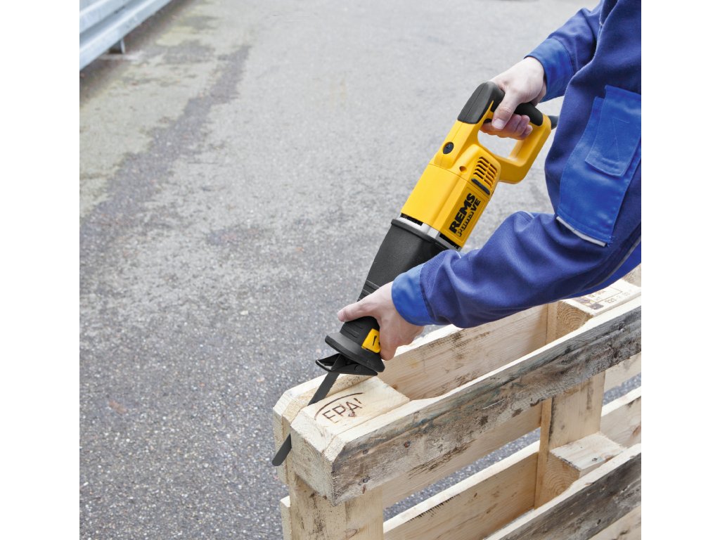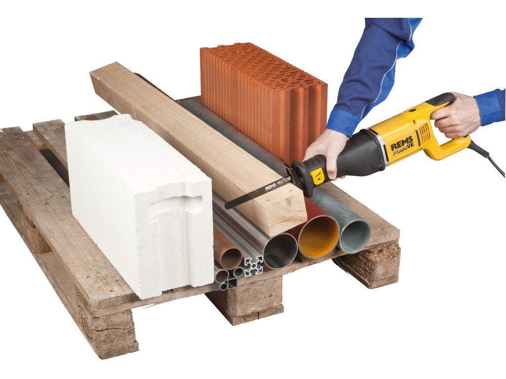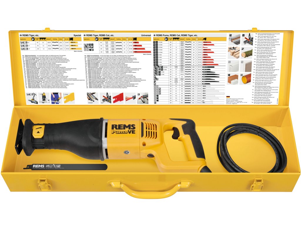 REMS Puma VE Set. Elektrická univerzální šavlová pila s vario-elektronikou (VE) k řezání volně z ruky, s antivibračním systémem. Pohonná jednotka s uzavřenou rukojetí s měkkým úchopem, chráněným klikovým ústrojím, pracujícím bez údržby, silným, výkonným univerzálním motorem 230 V, 50 – 60 Hz, 1300 W, bezpečnostním spínačem, přívodním vedením 4 m. Plynulé elektronické řízení počtu zdvihů (akcelerační spínač) 0 až 2800 min-1. 30 mm zdvih. Upínač pilového listu s rychlovýměnným systémem. Přestavitelná opěra. Šestihranný klíč. 1 kus REMS pilového listu 210-1,8/2,5. V pevném kufru z ocelového plechu.