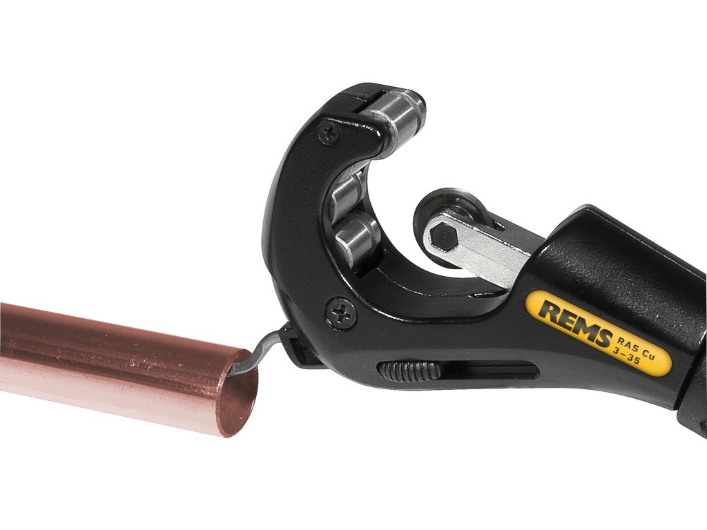 Speciálně kalené řezné kolečko z osvědčené, velmi pevné REMS oceli na závitořezné čelisti zajištuje dlouhou životnost. Rychlá výměna řezného kolečka bez použití nářadí díky ose řezného kolečka s kuličkovým zajištěním. Řezné kolečko je díky omezení přestavovacího pohybu chráněno před kontaktem s opěrnými válečky.