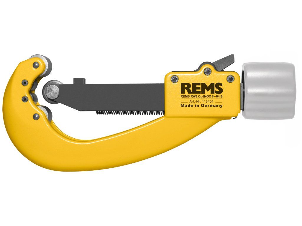 REMS RAS Cu-INOX 8–64 S a REMS RAS Cu-INOX 8 – 42 S s řezným kolečkem a protitlačnými válci uloženými v jehlových ložiscích pro mimořádně snadné řezání. Rychlopřestavení nastavovacího vřetena v obou směrech. Pouze jedno řezné kolečko pro pracovní oblast Ø 3–120 mm.