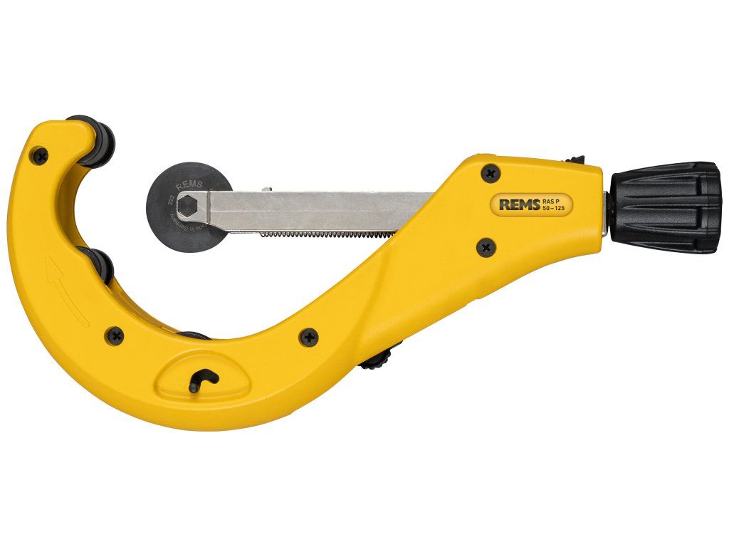 REMS RAS P 50 – 125 s integrovaným odhrotovačem trubek, otočně uloženým, přizpůsobujícím se odhrotovávané hraně obrobku. Speciálně tvrzená a speciálně broušená univerzální odhrotovací čepel zaručuje snadné odhrotování a extrémně dlouhou životnost. Rychlá a jednoduchá výměna čepelí. Dodatečný vodící váleček, nastavitelný, k dělení trubek Ø 110 mm nebo Ø 125 mm. Rychlá výměna řezného kolečka bez použití nářadí díky ose řezného kolečka s kuličkovým zajištěním.