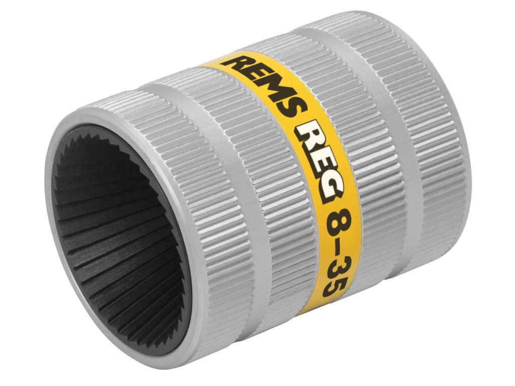 REMS REG 8 – 35. Odhrotovač na vnitřní a vnější odhrotování trubek. Na nerezové ocelové trubky, jiné ocelové trubky, měděné, mosazné, hliníkové a plastové trubky, Ø 8 – 35 mm, Ø ⅜ – 1⅜". V blistrovém balení.