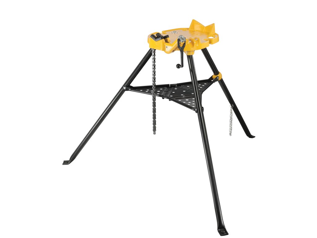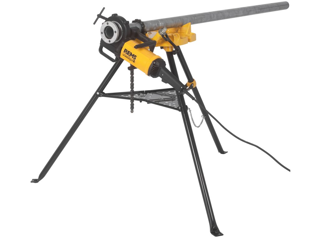 REMS Aquila 3B. Stanice pro opracování trubek s řetězovým upínacím svěrákem na trubky k upínání trubek, plného materiálu, Ø 10 – 165 mm, Ø ⅛ – 6". Pracovní deska s integrovaným řetězovým upínacím svěrákem na trubky s dvojitou upínací čelistí, podpěrou trubek, držáky nástrojů, 3-mi ohýbacími přípravky k ohýbání trubek Ø 10–26 mm, Ø ⅜–¾", upínací hlavou. Skládací třínohý podstavec s odkládací deskou. Nosné zatížení ≤ 450 kg. V kartonu.