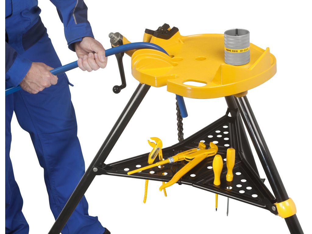 Stabilní, v krutu pevná litinová konstrukce pracovní desky s integrovaným řetězovým upínacím svěrákem na trubky, podpěrou trubky, držáky nástrojů, 3 ohýbací přípravky k ohýbání trubek Ø 10–26 mm, Ø ⅜–¾", upínací hlavou. Speciálně ozubená dvojitá upínací čelist, snadno vyměnitelná, prizmatická, ke spolehlivému upínání trubek v celém upínacím rozsahu. Speciálně kalená, s dlouhou životností. Upínací řetěz se stabilními články, snadno napínatelný díky rychlozapínání a vřetenu s trapézovým závitem. Dobře přístupná pracovní oblast před řetězovým upínacím svěrákem na trubky umožňuje volné otáčení i dlouhých nástrojů. Mimořádně vhodná při instalaci trubek, např. k dělení, řezání závitů, ohýbání, montáži. Nastavitelná upínací hlava k upínání do stanic pro opracování trubek mezi strop a podlahu, pro mimořádně bezpečné stání. Osvědčený třínohý podstavec pro bezpečné stání, skládací, pro jednoduchou instalaci a snadnou přepravu. Praktická odkládací deska pro nástroje a pracovní materiál. Výškově nastavitelné podpěry materiálu REMS Herkules (strana 115).