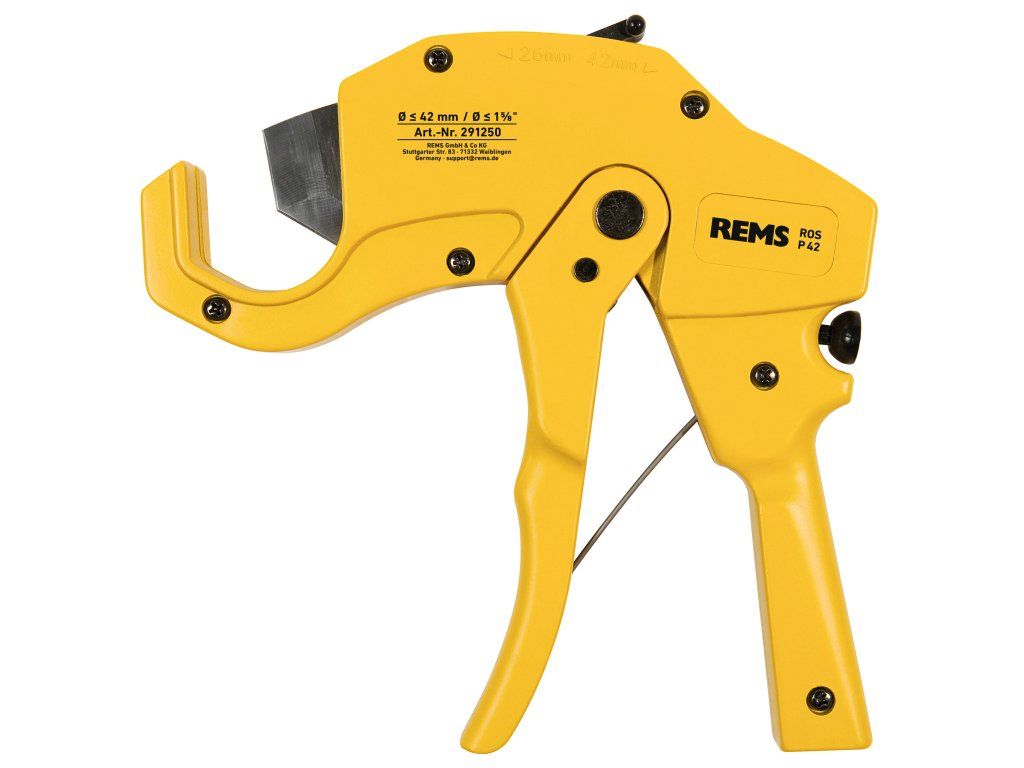 REMS ROS P 42 s rychloposuvem vzad. Jednoruční nůžky na plastové a vrstvené trubky. S čepelí. V blistrovém balení/v kartonu.