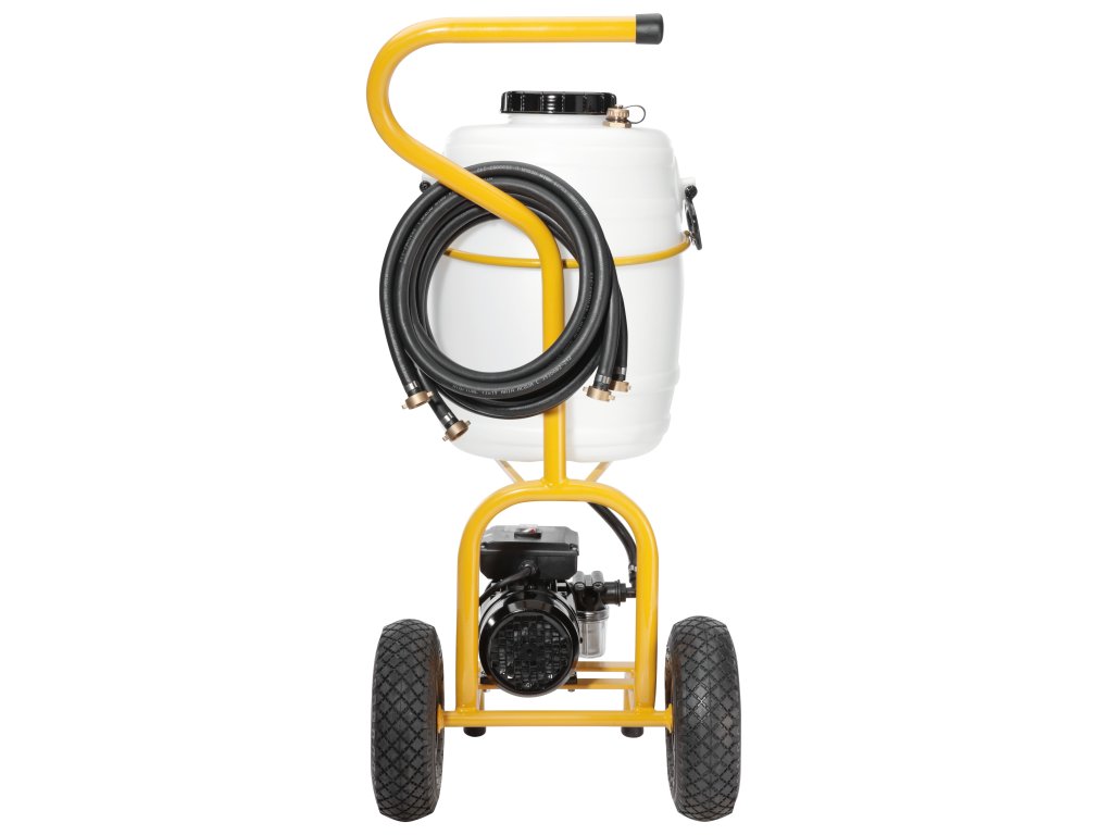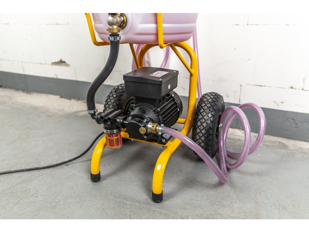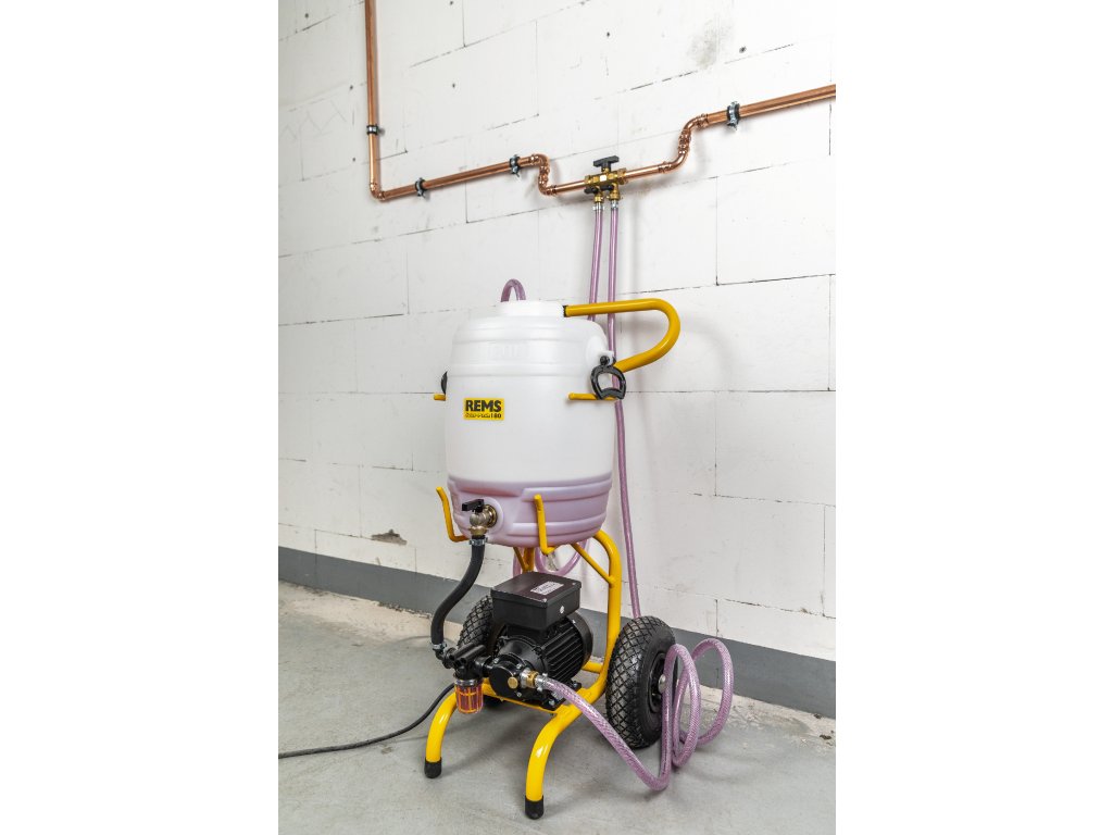 REMS Solar-Push I 80. Elektrická plnící a proplachovací jednotka k jednoduchému a rychlému plnění, proplachování a odvzdušňování uzavřených systémů. Plnící množství ≤ 27 l/min, objem zásobníku 30 l. S lamelovým čerpadlem, za trvalého zatížení odolného teplotám ≤ 80°C. Plnící tlak ≤ 0,65 MPa/6,5 bar/94 psi. Kondenzátorový motor 230 V, 50 Hz, 1000 W. Ventil na uvolnění tlaku. 2 ks pružných tkaných EPDM hadic ½" T100, každá 3 m dlouhá, odolné teplotám ≤ 100°C. Na stabilním podstavci z ocelových trubek se vzduchem plněnými koly. V kartonové krabici.