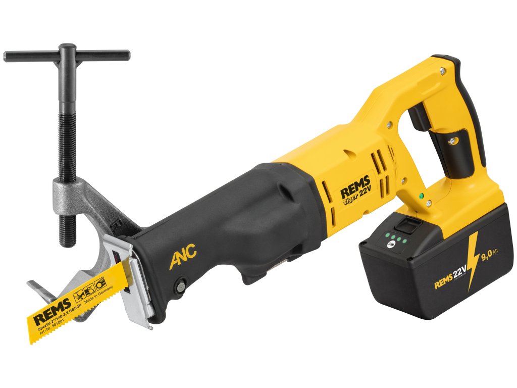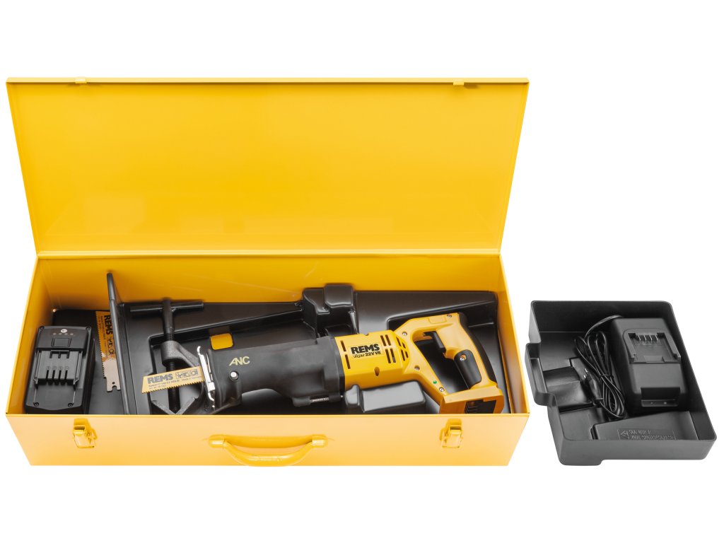 Akumulátorová šavlová pila na trubky s Vario-Elektronikou (VE) pro snadné, rychlé, pravoúhlé řezání s vodícím držákem nebo volně z ruky. Pohonná jednotka s uzavřenou rukojetí, bezúdržbovým oscilačním pohonem chráněným proti vodě a prachu, klikovým pohonem všestranně uloženým v jehlových ložiscích (ANC), agresivním orbitálním zdvihem, výkonným akumulátorovým motorem 22 V, 500 W, bezpečnostním tlačítkovým spínačem. Plynulé elektronické řízení frekvence zdvihů (akcelerační spínač) 0 až 1900 min-1. Kontrola stavu stroje s ochranou proti přetížení, sledování teploty, kontrola stavu nabití. Univerzální upínka pilového listu. Šestihranný klíč. Vodící držák 2". 2 kusy REMS speciálních pilových listů 2"/140-3,2. V pevném kufru z ocelového plechu.