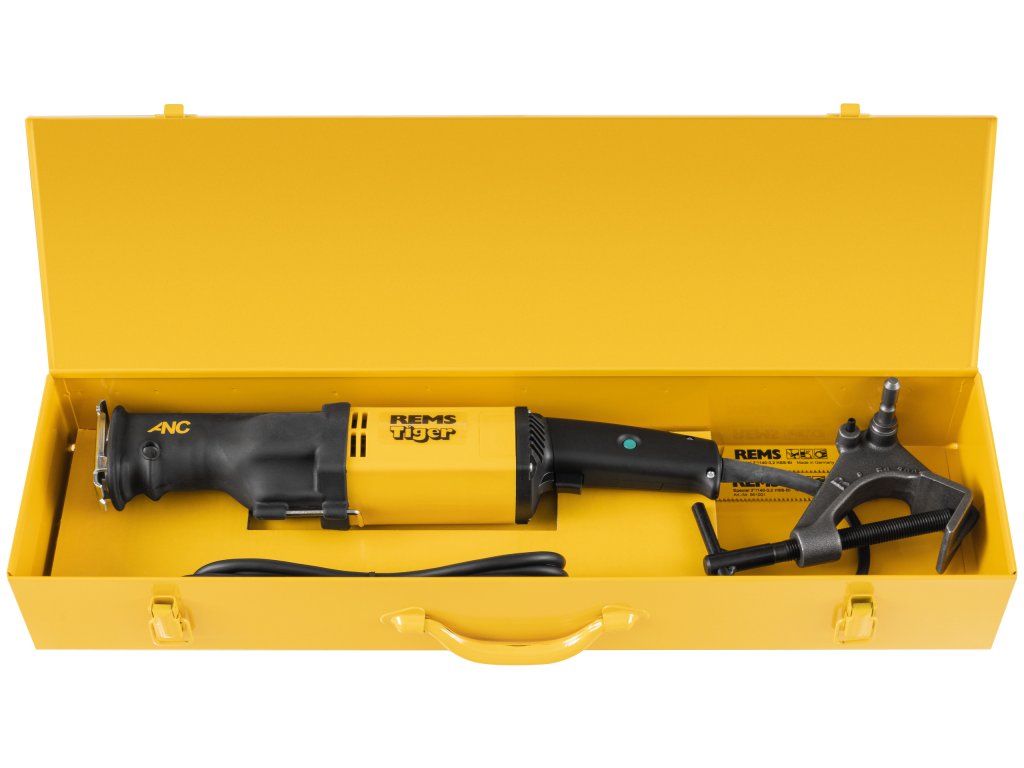 REMS Tiger Set. Elektrická šavlová pila na trubky pro snadné, rychlé, pravoúhlé řezání s vodícím držákem a pro řezání volně z ruky. Pohonná jednotka s přímou rukojetí, s bez údržby pracujícím oscilačním pohonem, chráněným před vodou a prachem s klikovým pohonem všestranně uloženým v jehlových ložiskách (ANC), agresivním orbitálním pohybem, univerzálním motorem 230 V, 50–60 Hz, 1050 W se silným tahem, bezpečnostním spínačem. Pevně nastavený počet zdvihů 2400 min-1. Ochrana proti přetížení. Univerzální upínka pilového listu. Šestihranný klíč. Vodící držák 2". 2 kusy REMS speciálních pilových listů 2"/140-3,2. V pevném kufru z ocelového plechu.