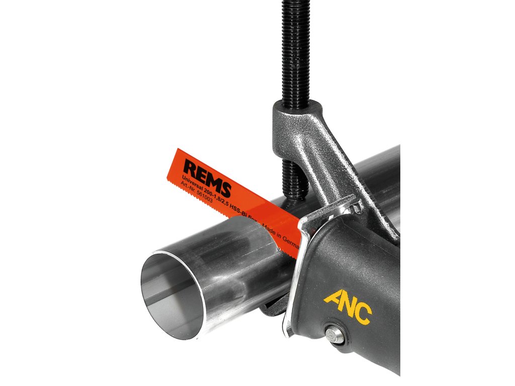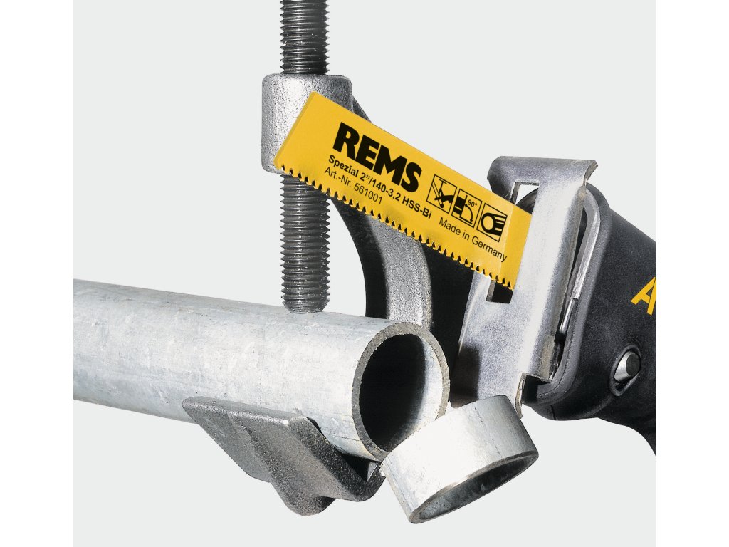 Speciální pilový list REMS (strana 76), extra silný, pevný v ohybu a krutu, s oboustranným úchytem, bezpodmínečně nutný k pravoúhlému řezání a k rychlé demontáži ocelových trubek s sílu přenášejícím vodícím držákem.
