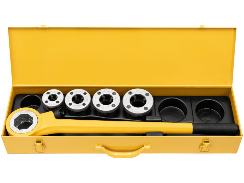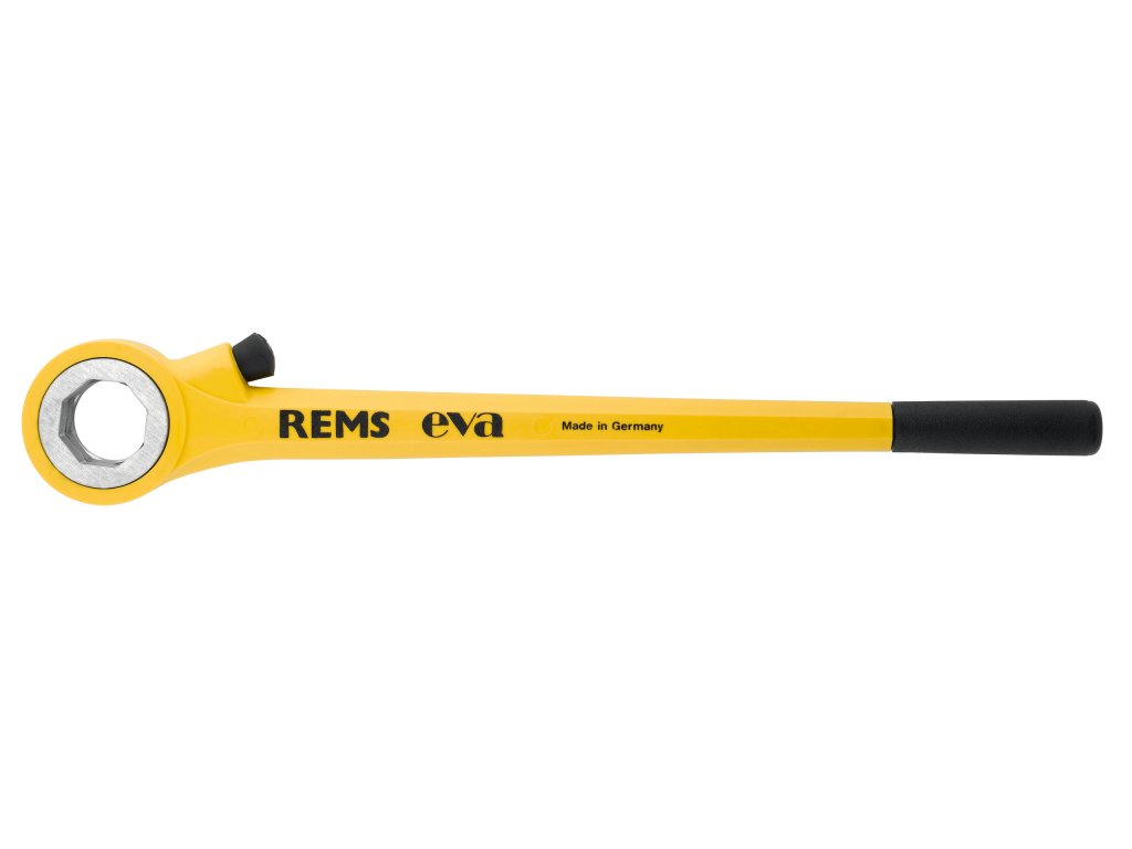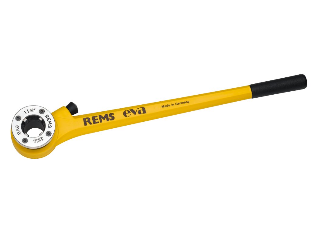 REMS eva – instalatérova závitnice. Velmi lehké nařezávání a řezání závitů. Ráčna z oceli, potažená silnou vrstvou plastu. Pouze jeden druh rychlovyměnitelných závitořezných hlav. Kvalitní nerezové závitořezné čelisti.